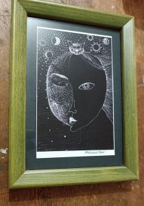 Mała grafika (kopia poligraficzna limitowana) w drewnianej, oliwkowo zielonej ramce, 11 na 15 cm całość.