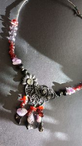 Ta kolia zawiera wiele cudownych kamieni naturalnych: od ciepłej energii korala, przez namiętność granatu, klarowność ametystu i tajemniczość tektytu. Do tego kryształy fasetowane i elementy metalowe w nurcie upcyklingu, nieco akrylu, a wszystko to na wygodnym, ukrytym pod drobnymi koralikami druciku.