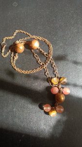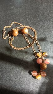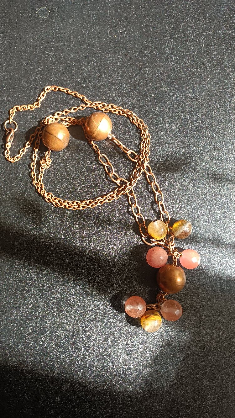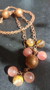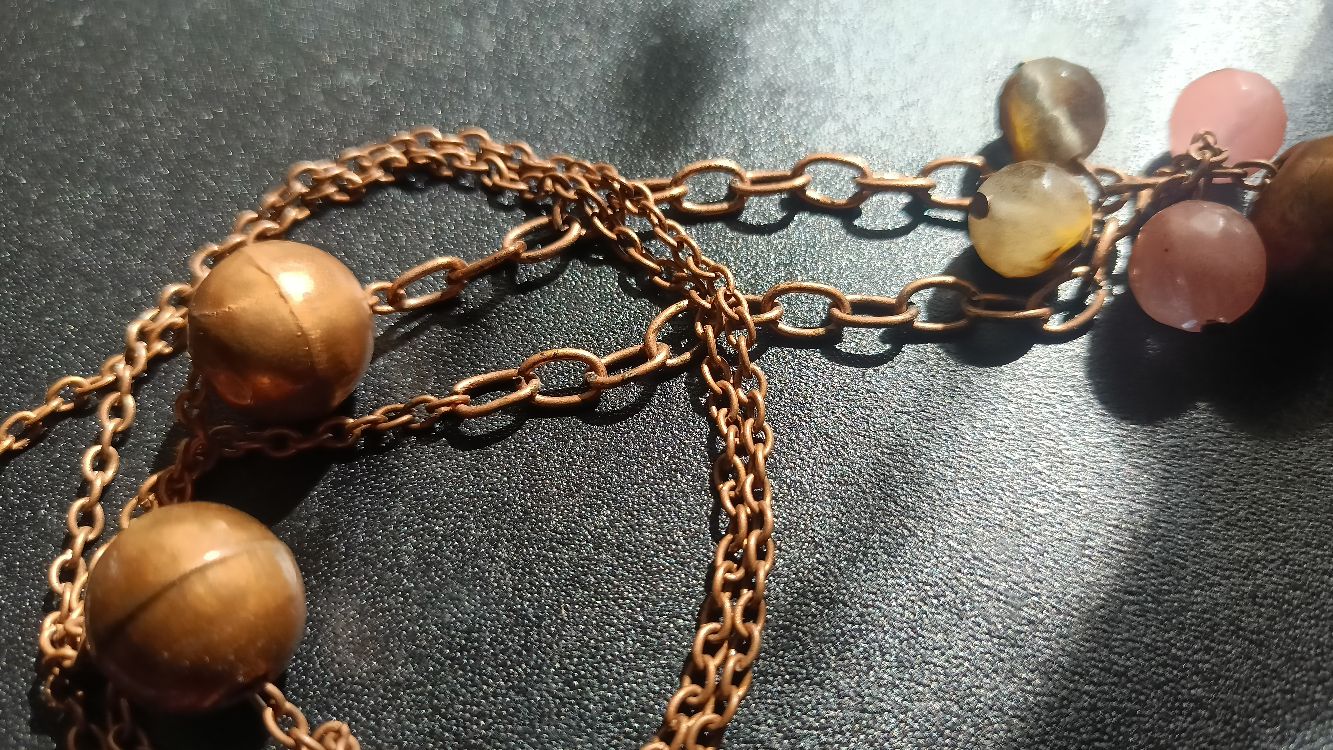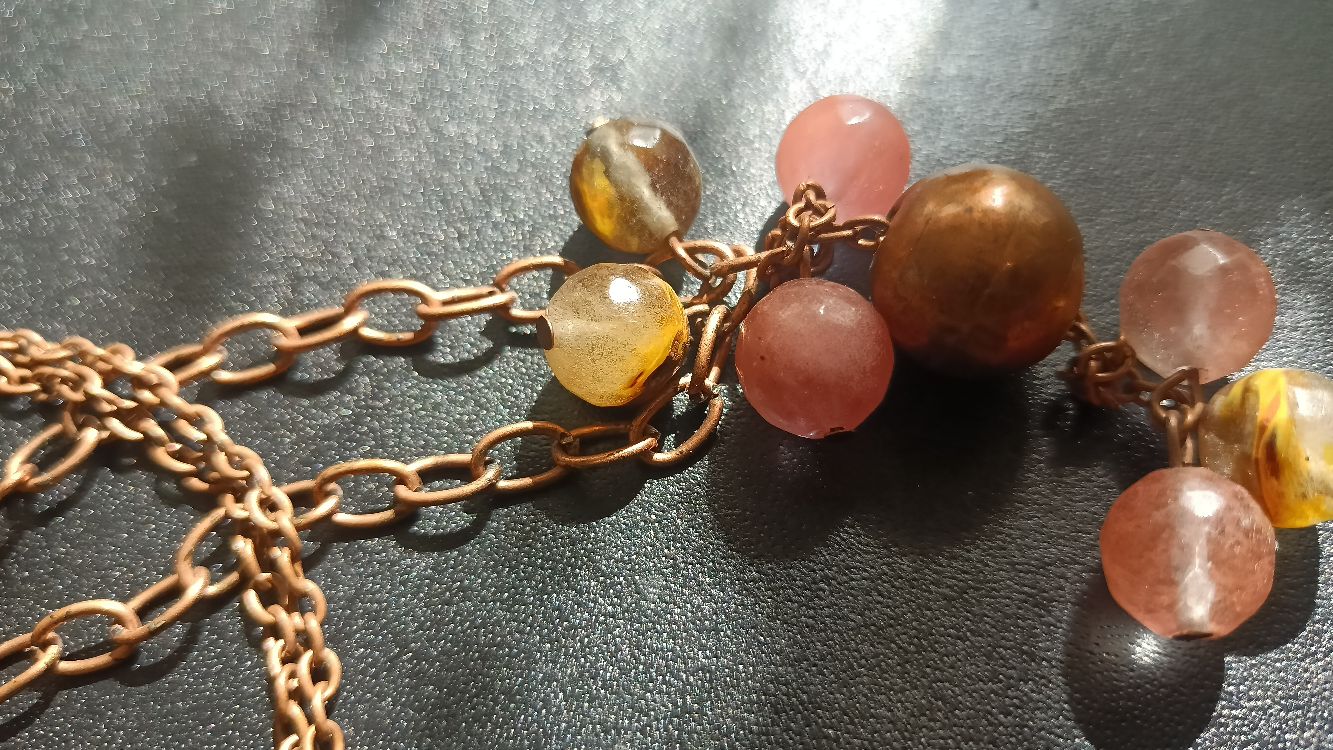 Naszyjnik Miedziany (o miedzianej biżuterii więcej na blogu), kulki miedziane ok.1,5 cm średnicy, i kwarc dymny oraz różowy 0.8 cm.