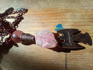 Naszyjnik pełen naturalnego bogactwa: miedź, drobne, nieregularne granaty i .. jeszcze raz granat, tym razem zaskakująco surowa bryłka i jasny różowy kolor. Nad wszystkim czuwa Anioł Raquiel. Biżuteria artystyczna. Gwarancja niepowtarzalności: 1 Projekt – 1 Sztuka