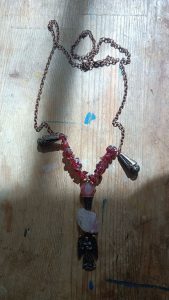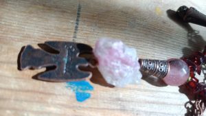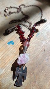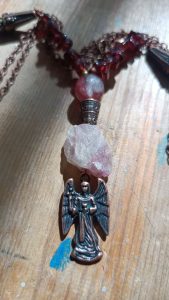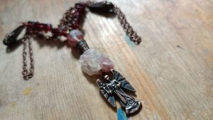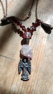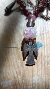 Naszyjnik pełen naturalnego bogactwa: miedź, drobne, nieregularne granaty i .. jeszcze raz granat, tym razem zaskakująco surowa bryłka i jasny różowy kolor. Nad wszystkim czuwa Anioł Raquiel. Biżuteria artystyczna. Gwarancja niepowtarzalności: 1 Projekt – 1 Sztuka