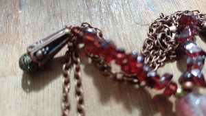 Naszyjnik pełen naturalnego bogactwa: miedź, drobne, nieregularne granaty i .. jeszcze raz granat, tym razem zaskakująco surowa bryłka i jasny różowy kolor.