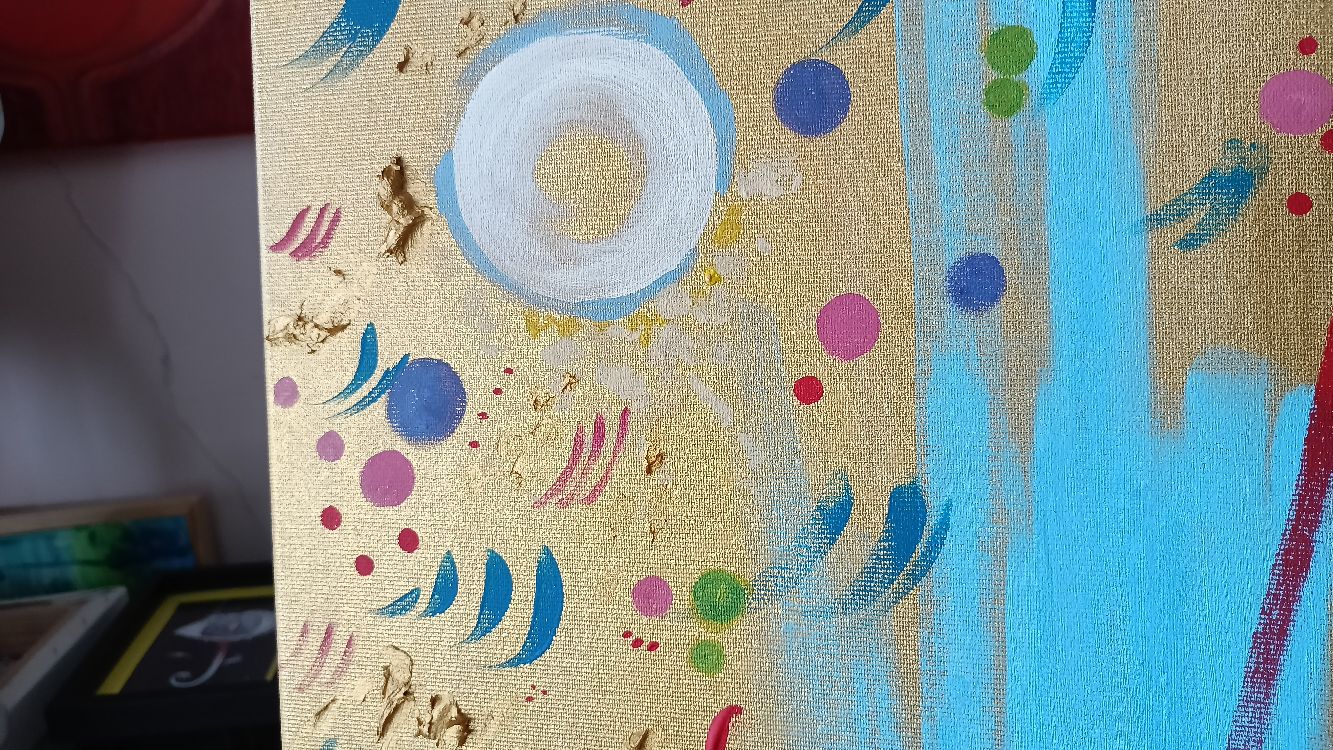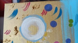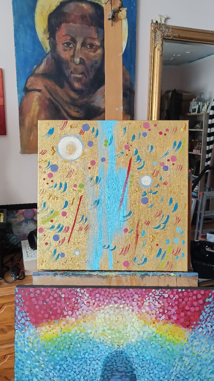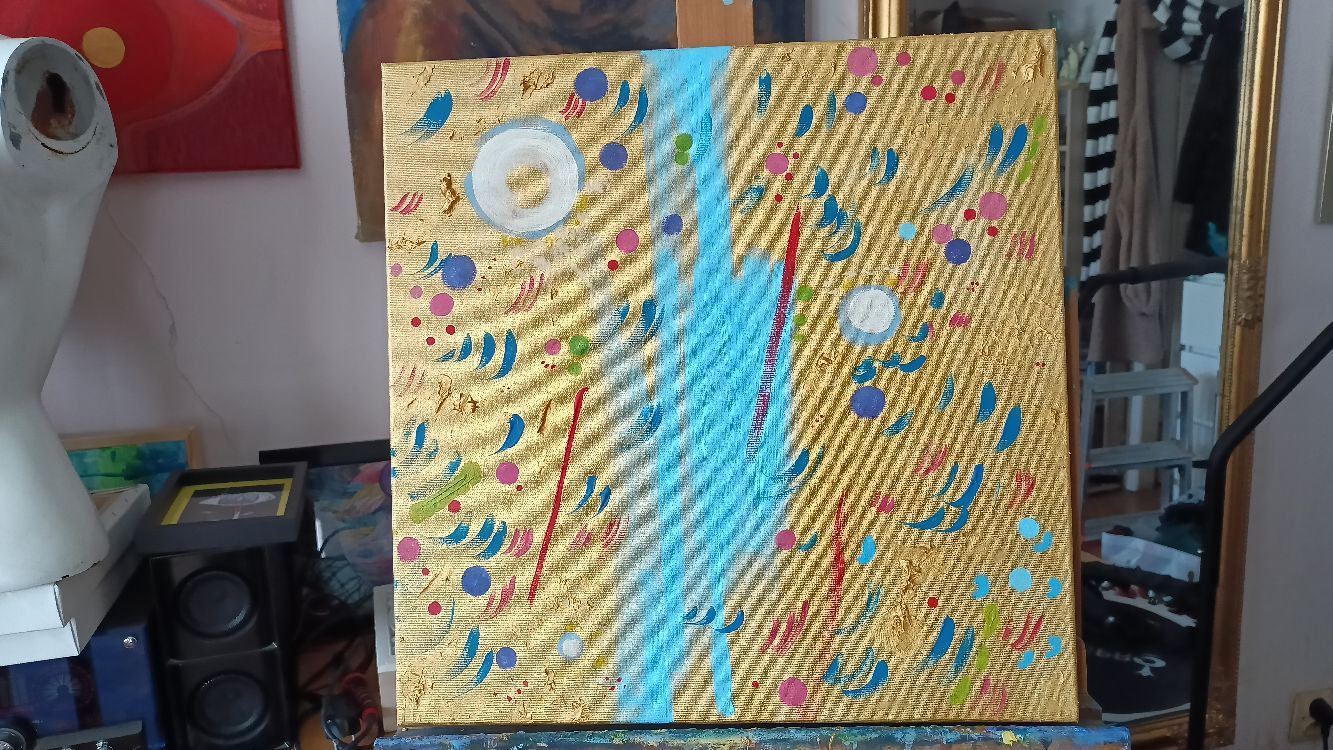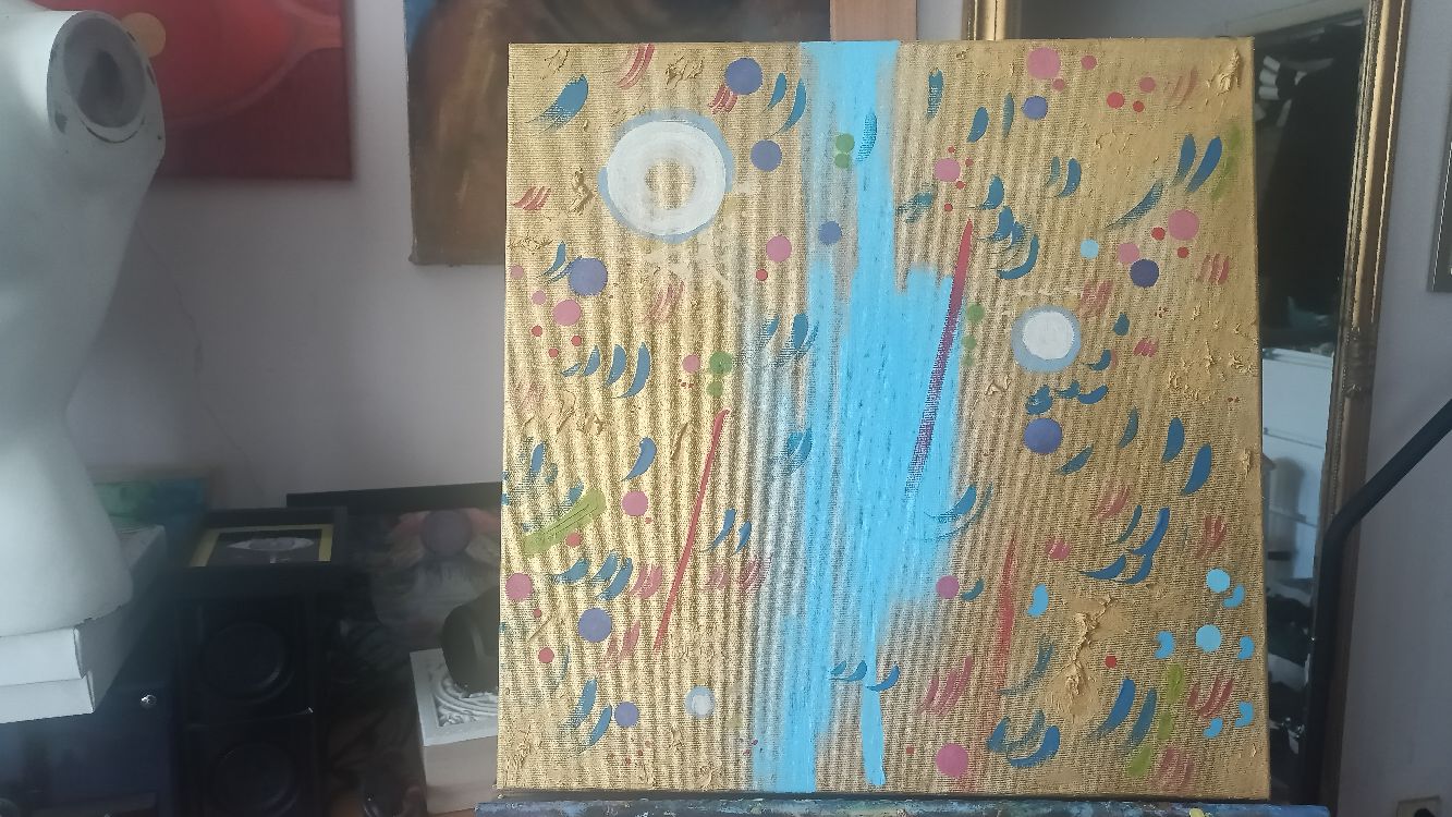 Obraz nietypowy w mojej twórczości – zdaje się, że kierowany potrzebą uchwycenia radości i złotych promieni ciepłego sezonu 🌞 Kompozycja lekka, radosna, złocista. Abstrakcja na grubym, solidnym blejtramie typu 3 D. Obraz nie zawiera płatków złota, które przydawały by mu wartości 😉, tym nie skuszę😄 – jakkolwiek, jeśli jest odpowiedzią na Twoje potrzeby estetyczne – zapraszam do zakupu! 45 na 45 cm
