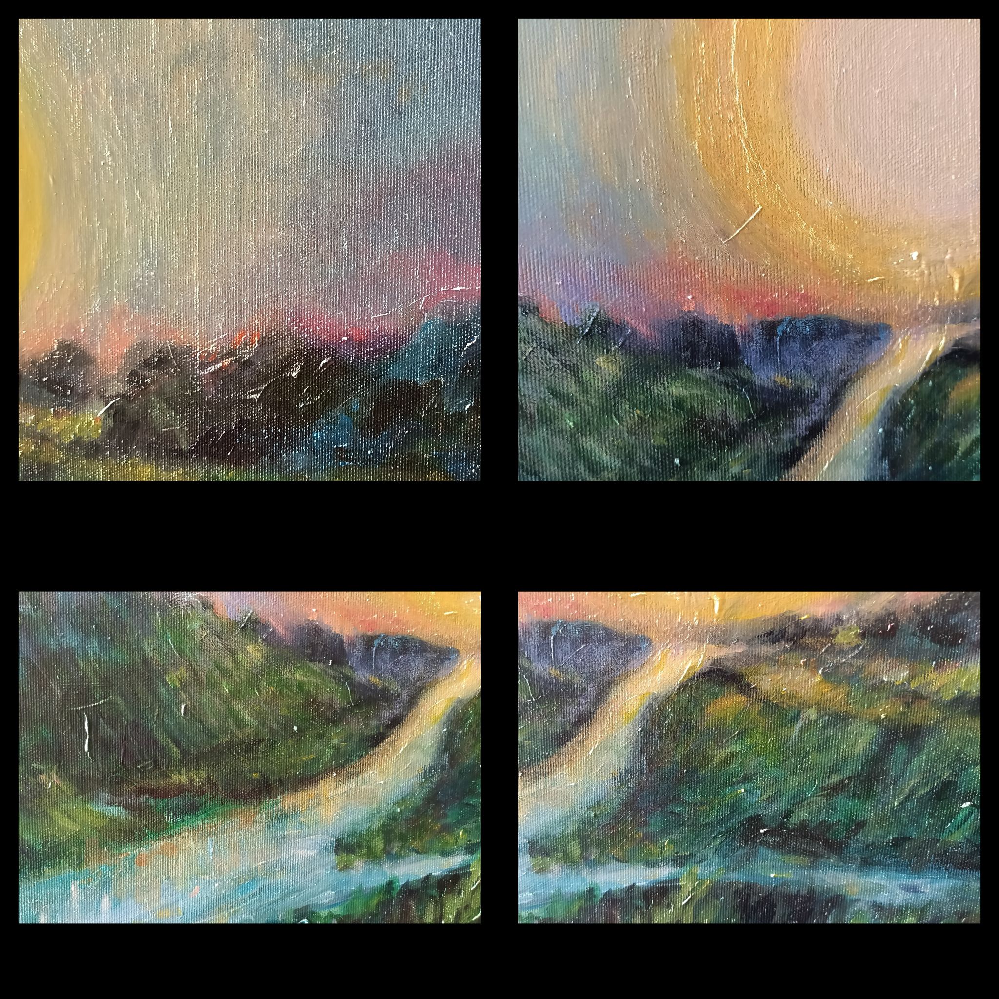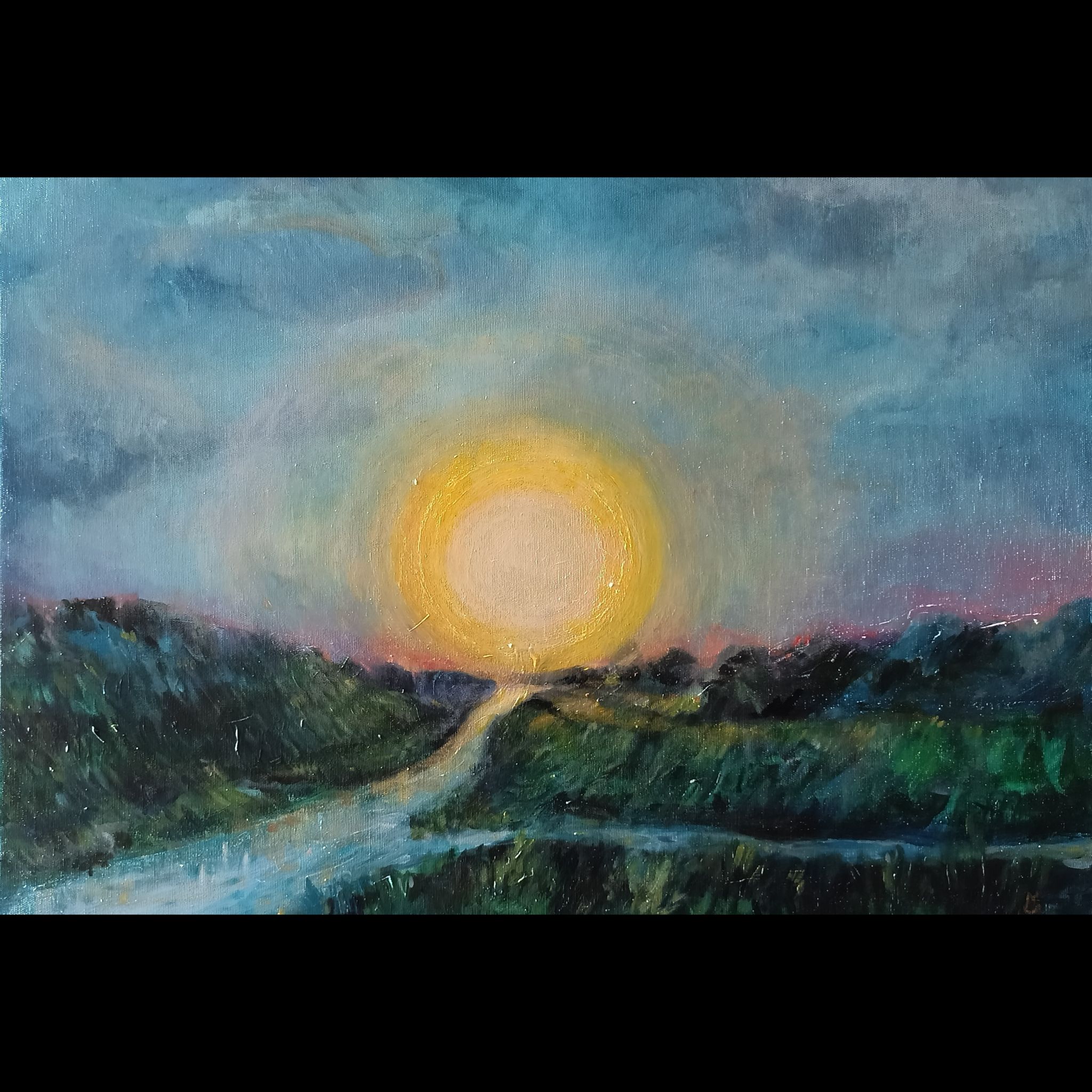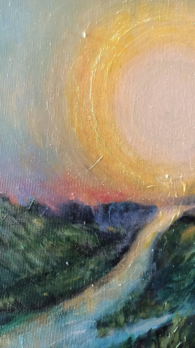 Słońce w Rzece – obraz na płótnie 50 na 70 cm, farby akrylowe. Więcej o tym, jak powstawał tutaj: https://malunachow.com/najnowsza-praca/ Ożywa we współpracy ze światłem dnia, inne oblicze ukazując w sztucznym oświetleniu.