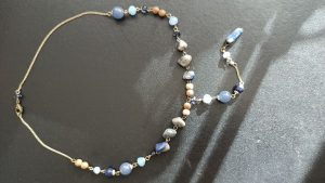 Delikatna kolia z mieszanych materiałów, jak drewno laurowe, akryl, szkło, zakończona Lapis Lazuli.