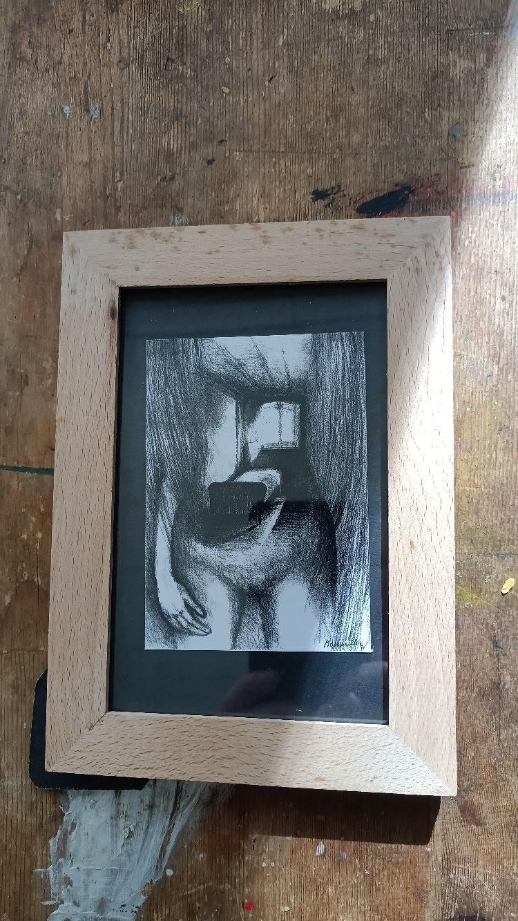 Niewielka, klimatyczna grafika (kopia poligraficzna sygnowana), całość wraz z drewnianą ramką 13 na 18 cm.